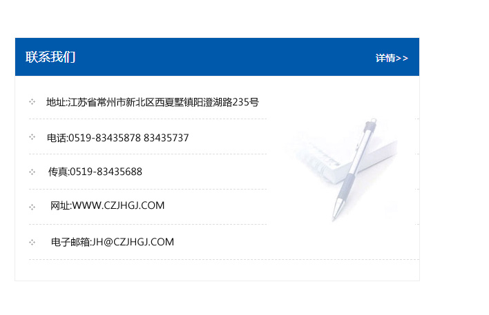 地址:常州市新北區友邦商務大廈1幢16、17層  電話:0519-85101652  傳真:0519-85112595  郵編:213022  網址:www_cz-jiayue_cn.scygmdjt.com  郵箱:xiajifengaa@163.com